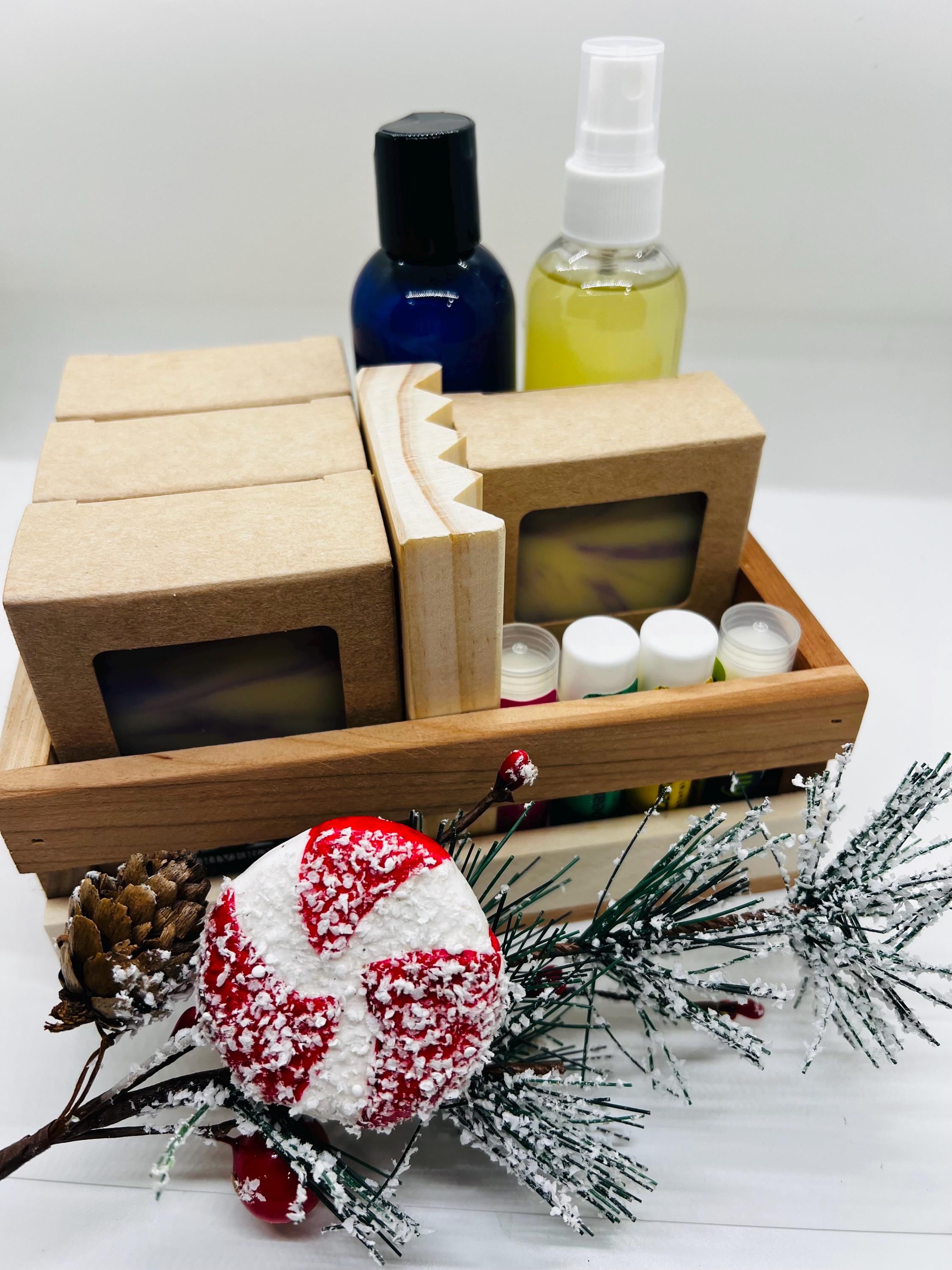 This Holiday crate contains (4) soaps of your choice, (1) soap dish, (1) lavender body lotion, (4) lip balms and (1) lavender spray hand sanitizer.